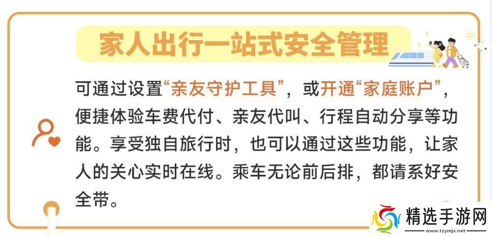 在家庭出行方面,滴滴推出了“亲友守护工具”和“家庭账户”功能,允许用户设置车费代付、亲友代叫以及行程自动分享等便捷操作。无论是独自出行还是与家人同行,这些功能都能让用户的行程更加安心,同时提醒所有乘客乘车时务必系好安全带。