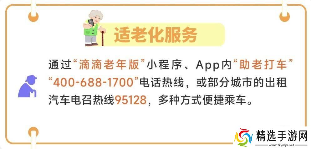 针对老年人群体,滴滴提供了“滴滴老年版”小程序和App内的“助老打车”服务,以及400电话热线和部分城市的出租汽车电召热线95128,多种渠道方便老年人便捷乘车。