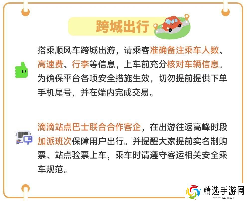 在跨城出行方面,滴滴站点巴士与合作客运企业联合,在出游往返高峰时段增加班次,保障用户出行需求。同时,滴滴也提醒用户在搭乘顺风车跨城出游时,应准确备注相关信息,并在客户端内完成交易,以确保各项安全措施有效执行。