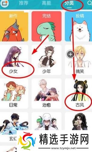 2、进入“首页”,点击“分类”,可以查看多样的漫画分类,可点击喜欢的漫画类型,进入阅读。