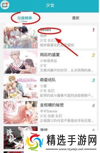 3、点击“少女”,“分类榜单”,可以查看最热的少女漫画内容,选择喜欢的漫画内容,点击进入,例如:seven。