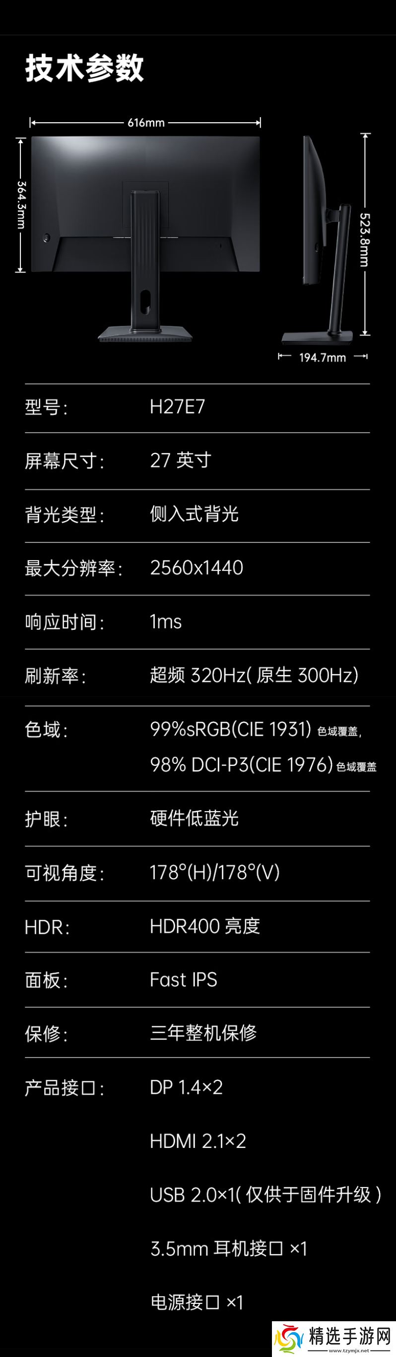 这款显示器配备2560x1440分辨率320Hz超频Fast IPS面板(原生300Hz),GtG响应速度1ms,覆盖99% sRGB和98% DCI-P3色域。