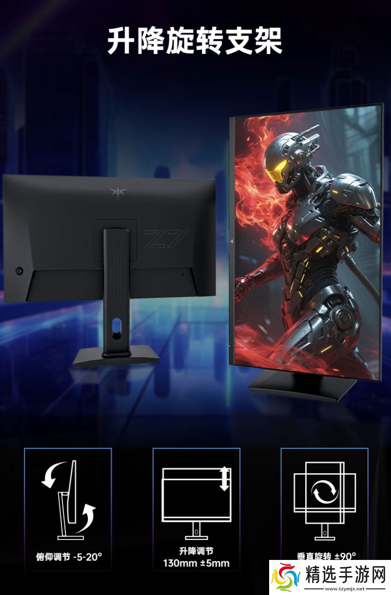 该机支架支持升降 / 倾斜 / 旋转,显示器本体支持VESA壁挂,提供2个 HDMI 2.1接口(320Hz)、2个 DP 1.4接口(320Hz)、1个 3.5mm音频接口、1个 USB-A 2.0接口(仅用于固件升级)。