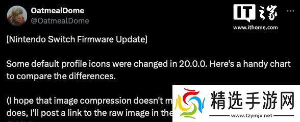 本站 4 月 30 日消息,玩家 OatmealDome 今日于 X 平台上发文表示,任天堂 Switch 游戏机在更新完 V20.0.0 系统后,个人资料中的部分头像有所调整,但整体调整幅度不大。