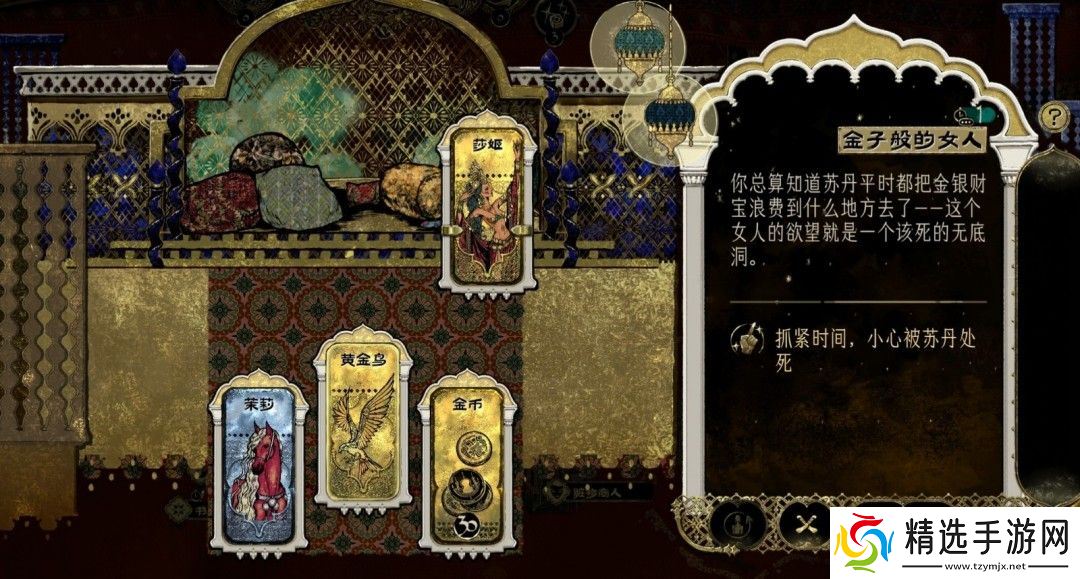 关于这个任务,金妃可以通过上朝使用金纵欲开启金妃线,然后付出奇珍,高魅力饰品和三十金币迎接莎姬,后续事件中和她谈谈获得莎姬的信物然后拖到她死亡即可,此处会有一张苏丹的猜忌,不及时消除也是会死的哦。