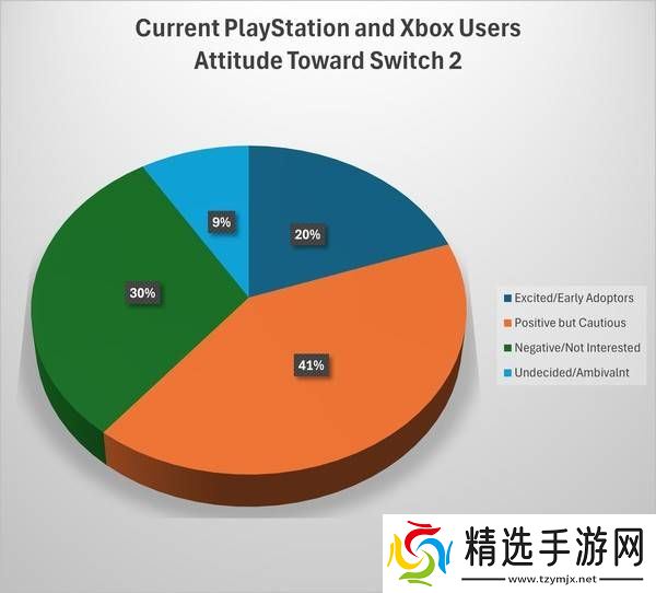 报告进一步指出,Switch 2在竞争激烈的市场格局中正展现出与PlayStation和Xbox比肩的竞争力。用户调研数据显示,61%的主机玩家对Switch 2持正面看法,其中20%的玩家表示“非常期待并将立即购买”,而41%的玩家则持“积极但谨慎”的态度。