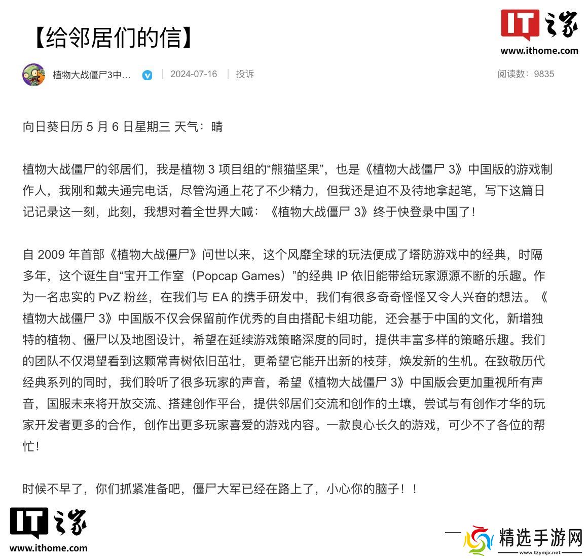 去年 7 月,《植物大战僵尸 3》官博发布了“给邻居们的信”,信中《植物大战僵尸 3》中国版的游戏制作人熊猫坚果透露,《植物大战僵尸 3》中国版不仅会保留前作自由搭配卡组功能,还会基于中国文化新增独特的植物、僵尸以及地图设计。