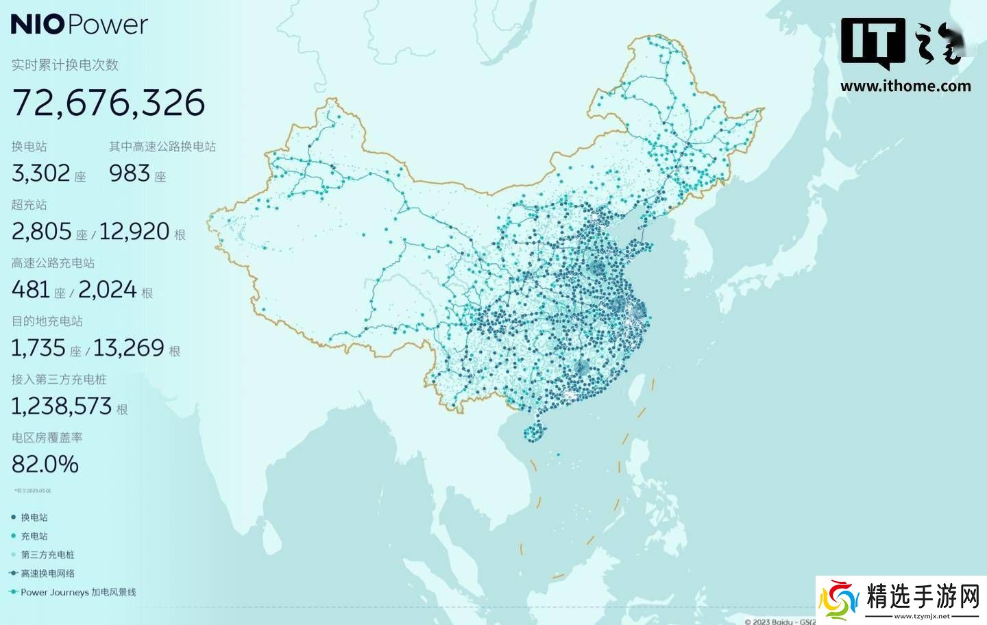 蔚来NIO Power的实时换电次数已累计超过7200万次,换电站总数达到3302座,其中高速公路换电站占比近三分之一,共有983座。高速公路充电站方面,蔚来已建成481座,配备2024根充电桩,为用户的长途旅行提供了强有力的充电保障。