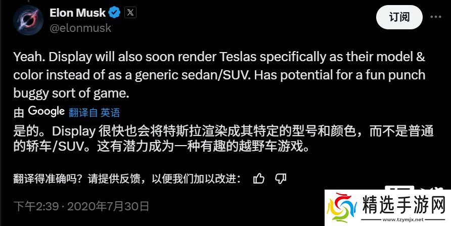 本站注意到,早在 2020 年 7 月,马斯克曾在 X 平台上表示,特斯拉车辆将很快能够在屏幕上显示其他特斯拉车辆的具体型号和颜色,甚至可以开发成一种类似“碰碰车”游戏的功能。尽管马斯克当时声称该功能将“很快”推出,但时至今日,这一承诺的兑现显然又经历了一段典型的“埃隆时间”。