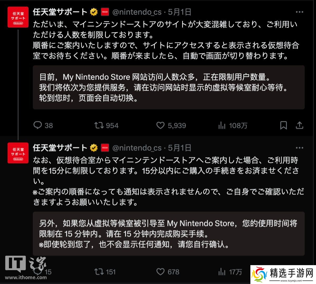 本站 5 月 2 日消息,任天堂客服的官方 X 账号昨日发布消息称,由于“My Nintendo Store”网站访问量激增,已启动人数管控机制。据日媒 ITMedia News 报道,任天堂采取此举的原因被认为是首批抽选中签者已开始办理 Switch 2 的购机手续。