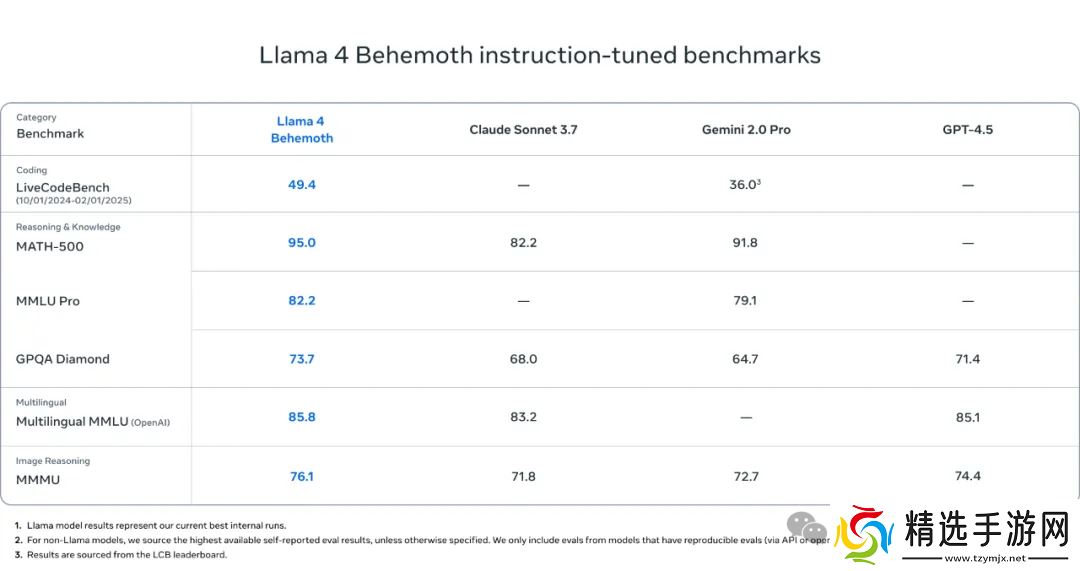 Llama 4 Behemoth:2 万亿参数的超大超强模型,以上二者都由这个模型蒸馏而来;目前还在训练中;多个基准测试超过 GPT-4.5、Claude Sonnet 3.7 和 Gemini 2.0 Pro。