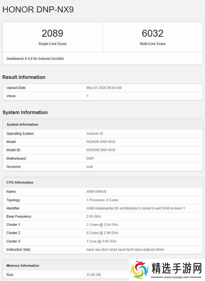 荣耀400 Pro在Geekbench 6.4.0版本中的表现不俗,单核得分为2089分,多核得分更是高达6032分。其搭载的处理器为骁龙8 Gen3降频版,CPU架构为1颗3.05 GHz的大核、5颗2.96 GHz的中核以及2颗2.04 GHz的小核,这样的配置无疑为该机提供了强大的性能支持。