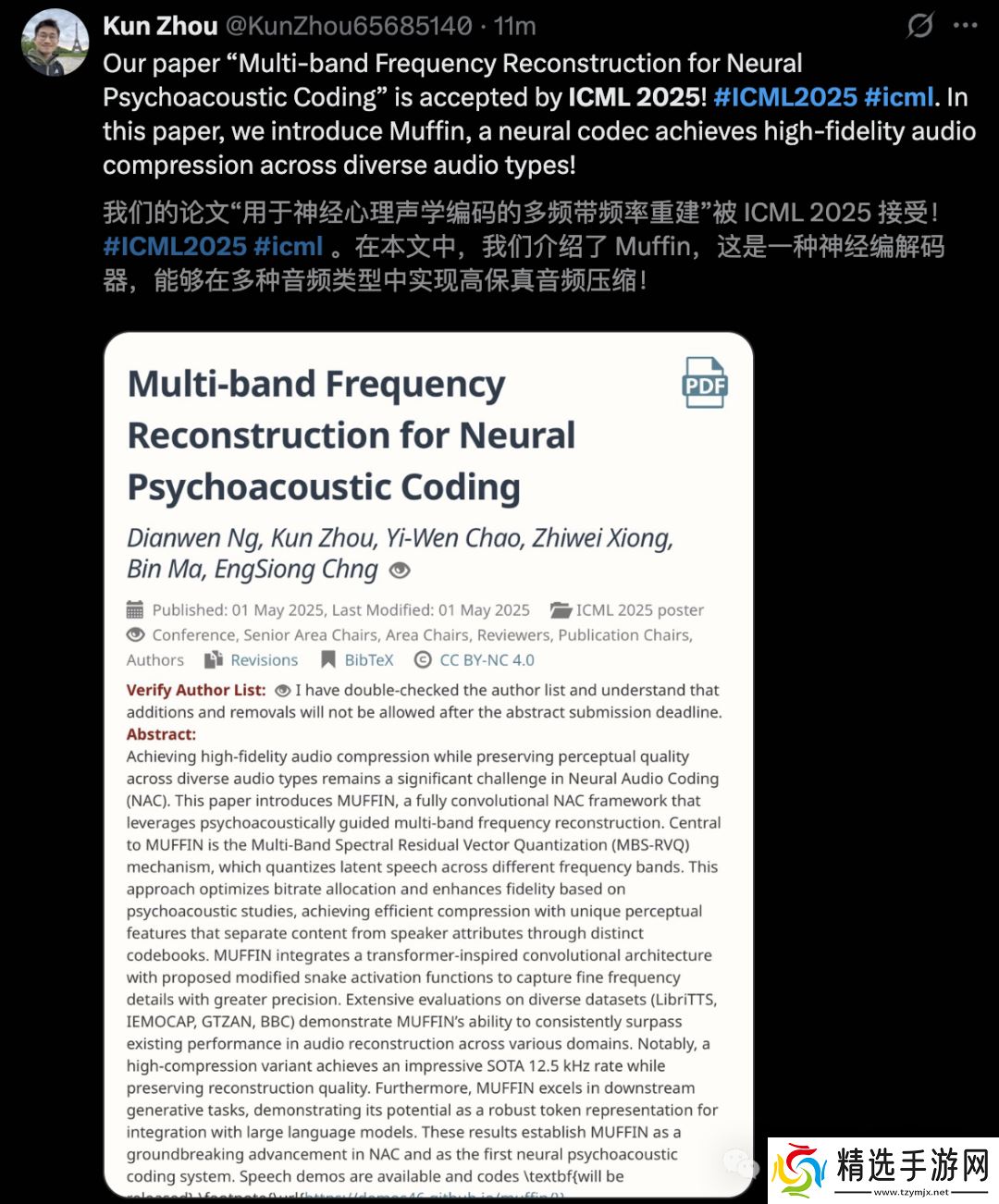 新加坡国立大学 Kun Zhou(周坤)一篇关于神经编码器 Muffin 被正式录用,这能够在多种音频类型中,实现高保真音频压缩。