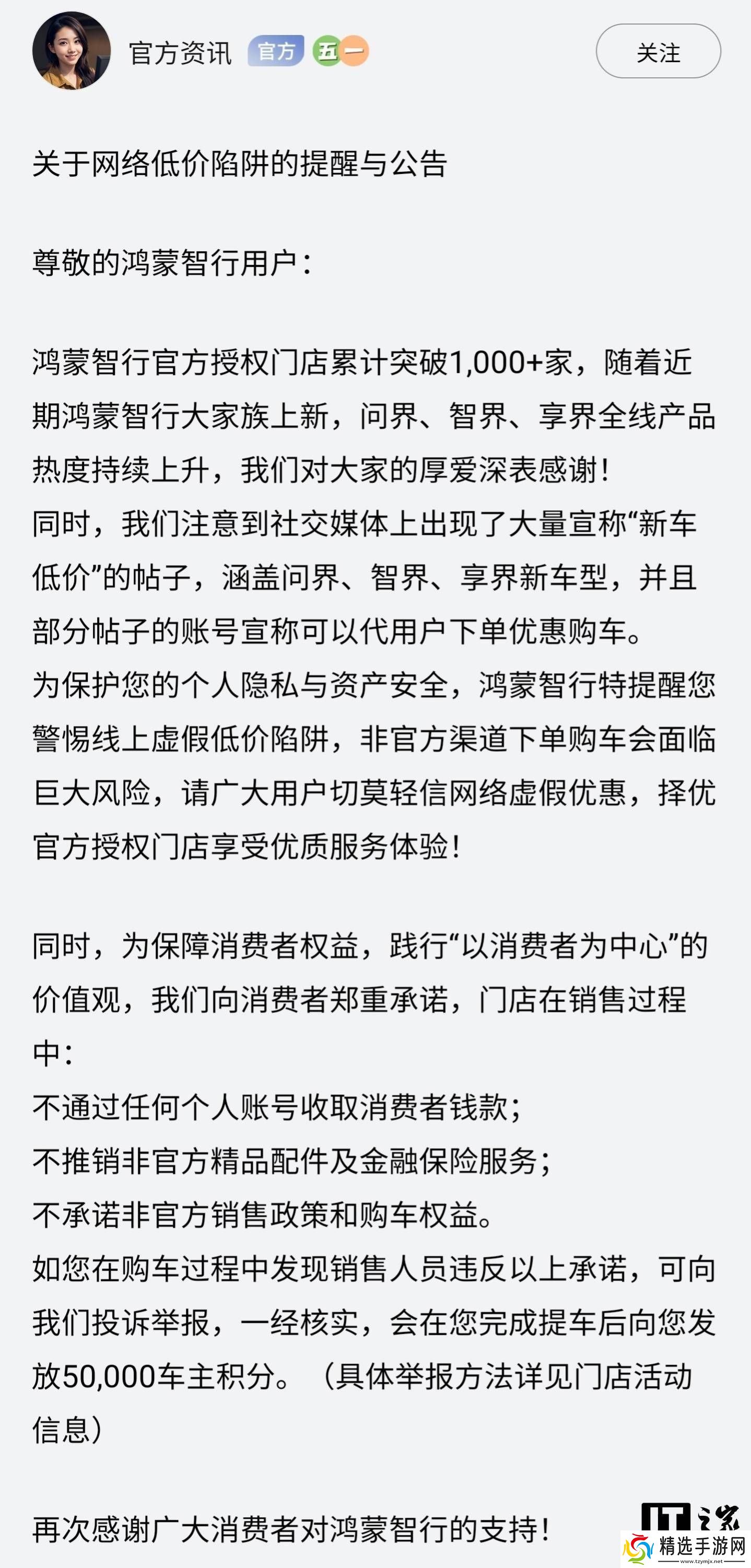 为了保护消费者的权益,鸿蒙智行特别提醒广大用户,在面对网络上的低价购车信息时,应保持警惕,切勿轻信虚假优惠。公告中明确指出,消费者应优先选择官方授权门店进行购车,以确保享受优质的服务体验。