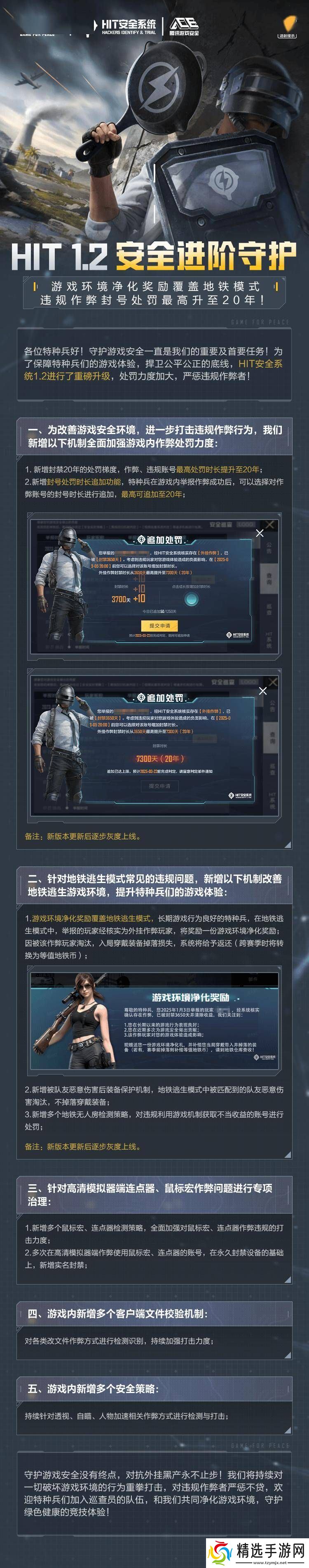 腾讯游戏安全中心近期宣布了对旗下热门游戏《和平精英》的重大安全升级,特别是其HIT安全系统升级至1.2版本,对违规作弊行为的打击力度空前加强,最高封号时长已提升至20年。
