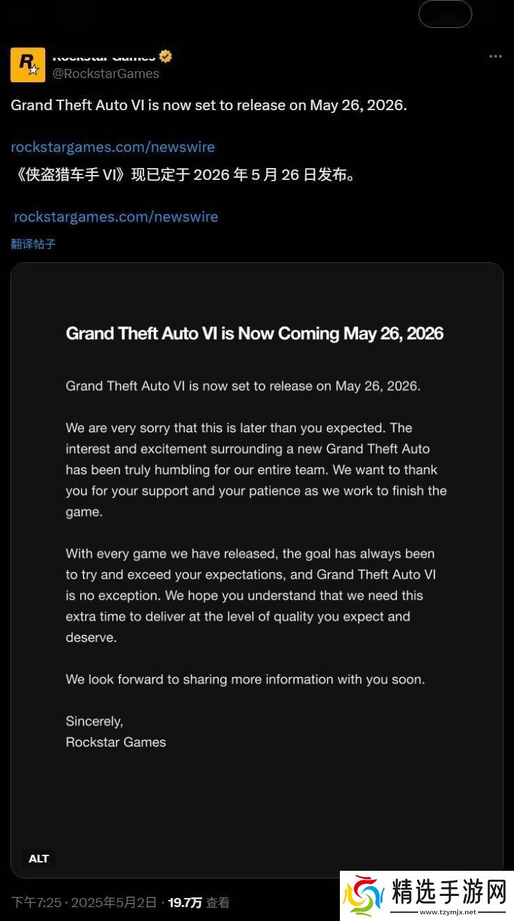 R星终于揭晓了《GTA6》的发售日期,这款备受期待的游戏将于2026年5月26日正式与玩家见面。这一消息在5月2日晚间由R星官方宣布,让众多粉丝翘首以盼的心情得以平复。