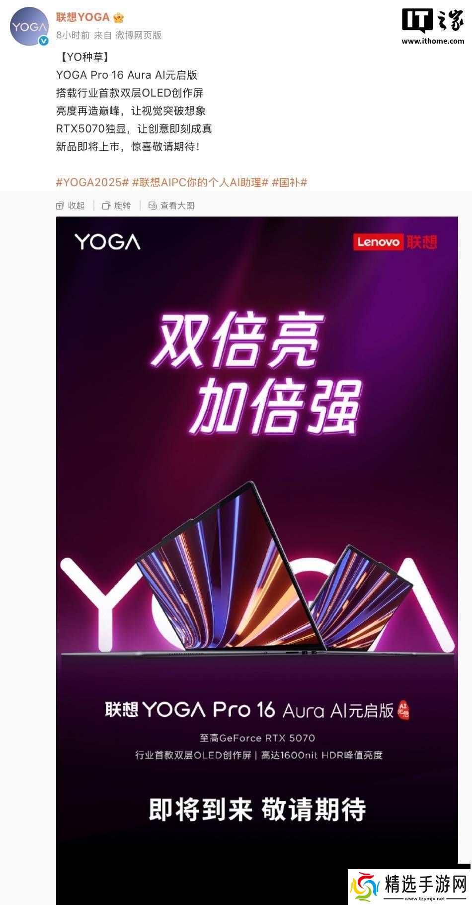 联想近日通过其YOGA官方微博揭晓了一款备受瞩目的新品——YOGA Pro 16 Aura AI 元启版笔记本电脑,这款电脑将于5月8日晚7点正式发布。据透露,这款笔记本不仅搭载了性能强劲的RTX 5070显卡,更在屏幕上实现了突破,号称是行业内首款配备双层OLED创作屏的笔记本,峰值亮度高达1600尼特。