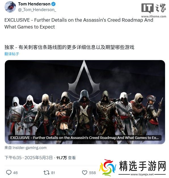 本站 5 月 4 日消息,Insider Gaming 的 Tom Henderson 昨日爆料称,育碧计划在未来六年内推出至少 9 款《刺客信条》新作,包括 2 款 RPG、3 款重制版,还有 1 款 "小型体验" 作品、2 款多人游戏及 1 款手游。