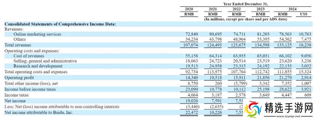 年报显示,百度 2020 年、2021 年、2022 年、2023 年、2024 年营收分别为 1070.74 亿元、1244.93 亿元、1236.75 亿元、1345.98 亿元、1331.25 亿元。
