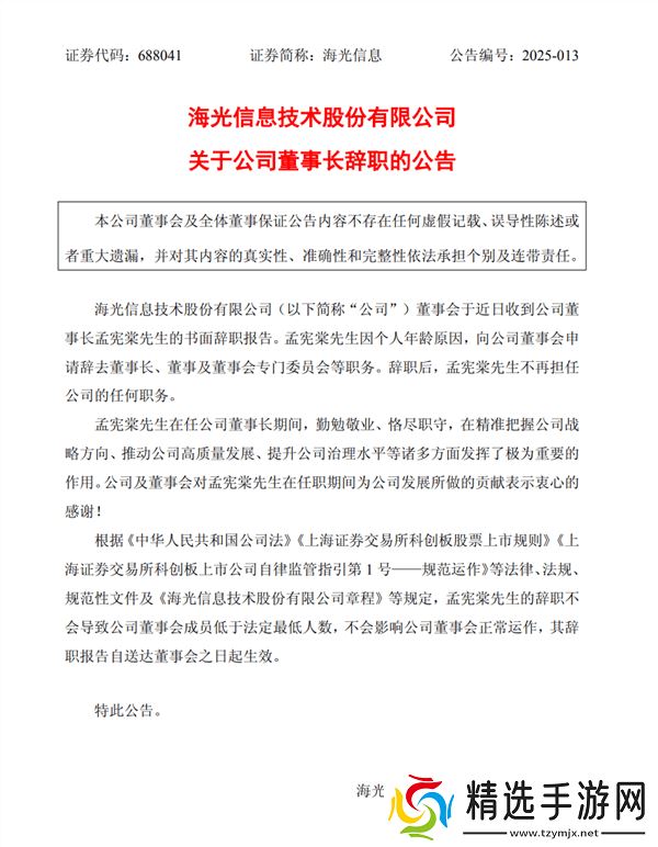 海光信息近日宣布了一则高层人事变动消息,其董事长孟宪棠已向公司董事会递交了辞职申请。