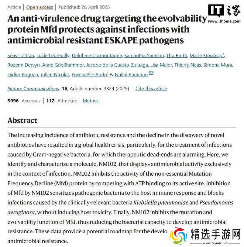 据悉,NM102分子通过精准地阻断致病菌的关键蛋白Mfd的功能,不仅显著增强了宿主免疫系统清除致病菌的能力,而且有效抑制了细菌耐药性的进化。这一研究成果已在《自然-通讯》期刊上发表,并成功申请了专利。