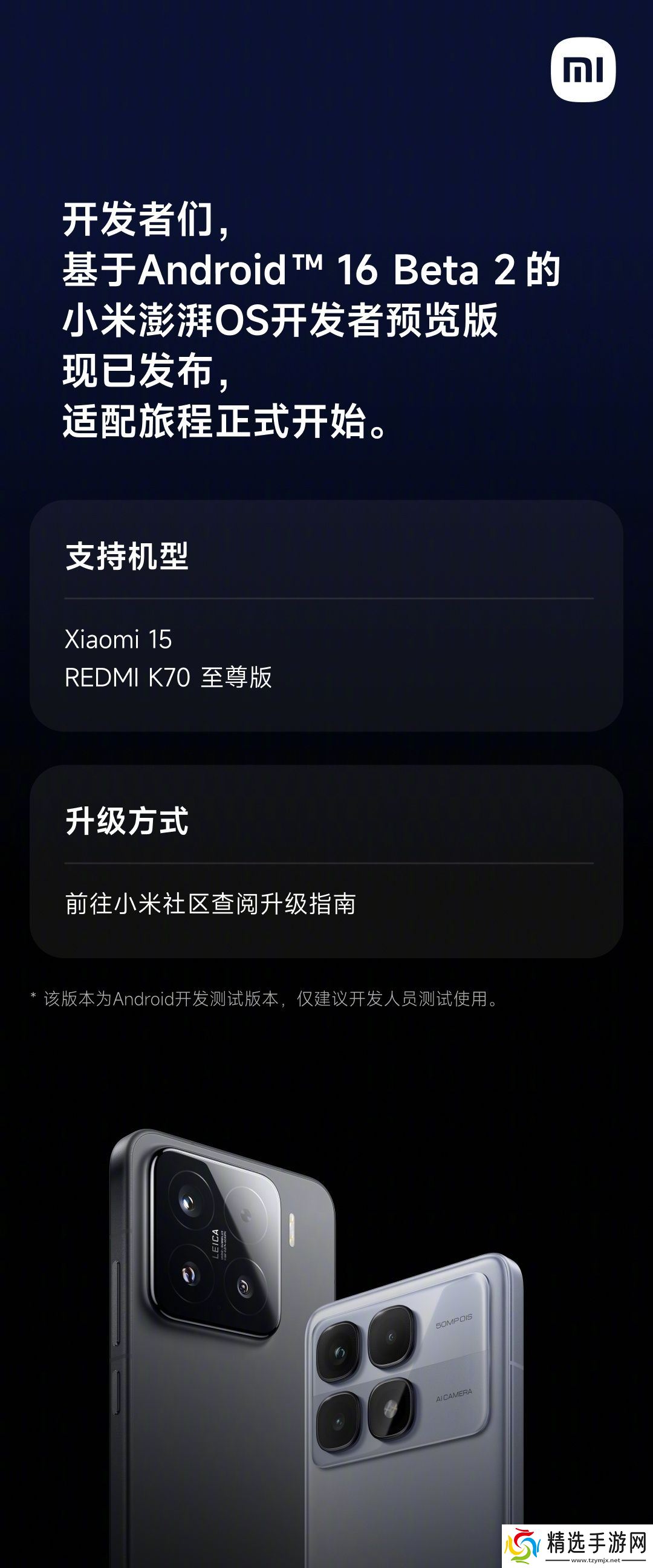 本站 4 月 8 日消息,小米澎湃OS发文,宣布基于安卓 16 Beta 2 的小米澎湃 OS 开发者预览版现已发布,即日起,开发者们可使用小米 15、REDMI K70 至尊版尝鲜适配。