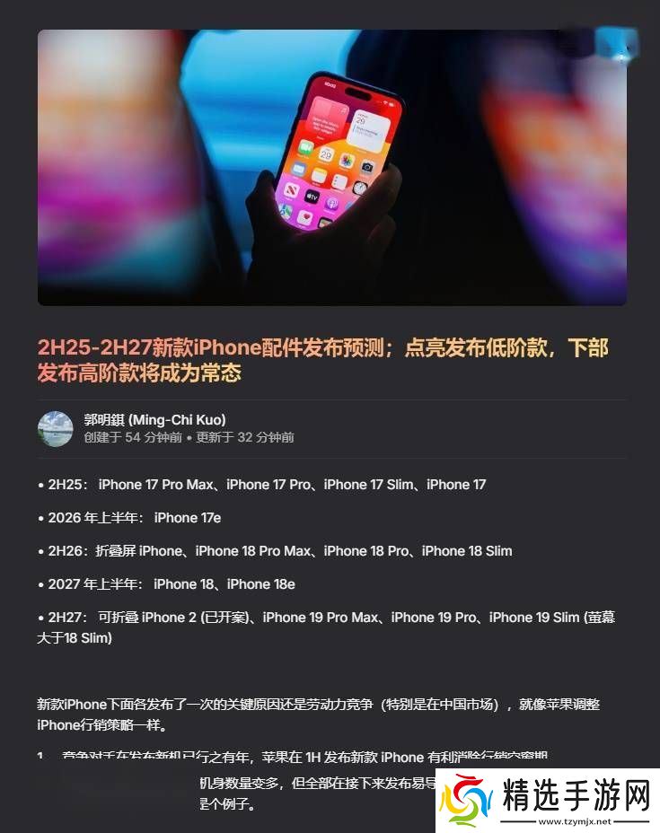 近期,知名苹果产品分析师郭明錤发布了一份引人关注的预测报告,详细阐述了苹果公司在2025年下半年至2027年下半年期间即将推出的iPhone新机型。这份预测不仅揭示了苹果未来两年的产品路线图,还解释了苹果改变iPhone发布策略的背后原因。
