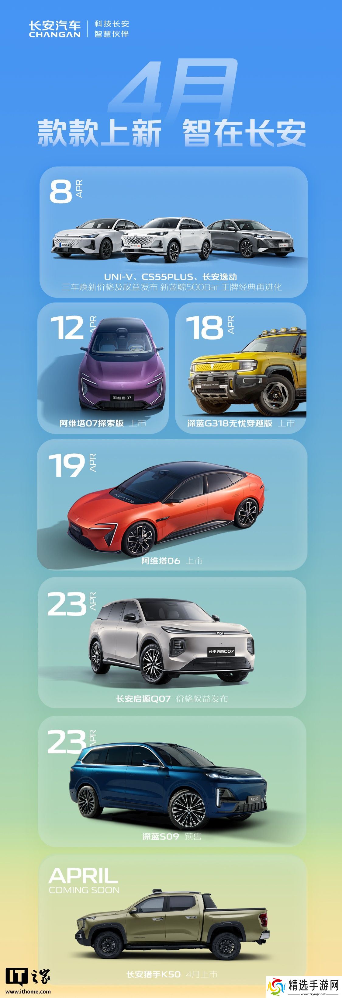 本站 4 月 8 日消息,长安汽车官方今日公布了 4 月新品计划,含阿维塔 06 / 07 探索版、启源 Q07 等 9 款车型。