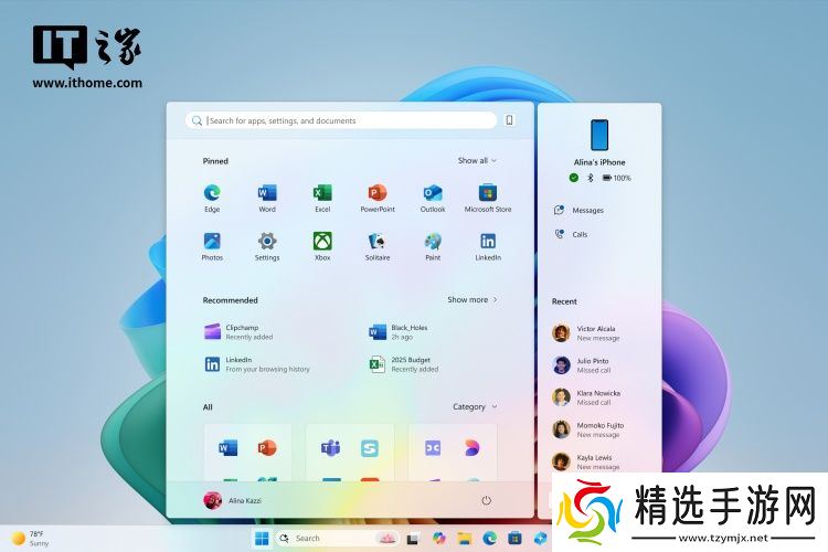 本站注意到,此次更新后的开始菜单在空间布局上更为宽敞,用户可以更轻松地滚动查看所有应用的视图,并且这些应用还按照类别进行了组织。除了在大屏幕上看起来更加美观外,新的开始菜单还将新增一个手机伴侣面板,用户可以通过该面板快速访问已同步的 iPhone 或安卓设备上的近期联系人、消息、通话记录、电池电量等信息。