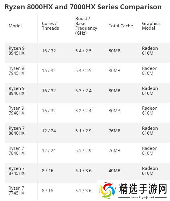 在锐龙8000HX系列中,ROG魔霸新锐2025所配备的锐龙9 8940HX显得尤为突出。与锐龙7000系列中的7940HX相比,8940HX的最高加速频率提升了100MHz,达到了5.3GHz,从而在性能上实现了细微的飞跃。然而,该系列中的其他型号,如锐龙9 8945HX、锐龙7 8840HX和8745HX,与它们的上一代对应型号7945HX、7840HX和7745HX在参数和性能上几乎如出一辙,难以察觉出显著差异。