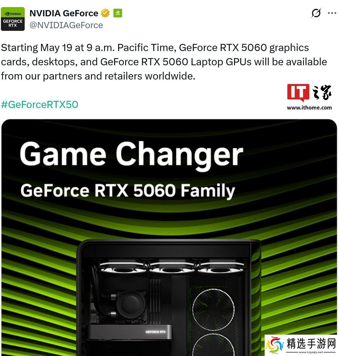 本站 5 月 6 日消息,英伟达官方于北京时间今日 21:00 宣布,GeForce RTX 5060 显卡和笔记本电脑 GPU 将于太平洋时间 5 月 19 日 09:00 开售。由于太平洋时间 (PT) 目前对应 UTC-7 的太平洋夏令时 (PDT),因此国内的开售时间为北京时间本月 20 日 00:00。