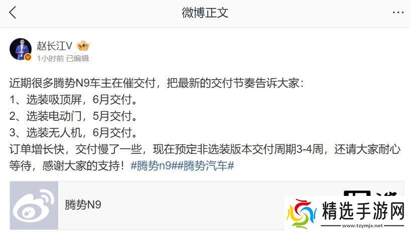 本站 4 月 8 日消息,针对近期腾势 N9 车主催交付的情况,比亚迪腾势销售事业部总经理赵长江今日发文公布了最新的交付节奏: