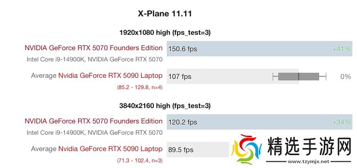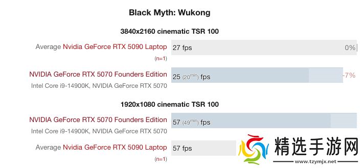 《黑神话:悟空》:在 4K 分辨率下 RTX 5090 移动版平均 27 帧,5070 桌面版平均 25 帧;在 1080P 分辨率下,两款显卡均为 57 帧