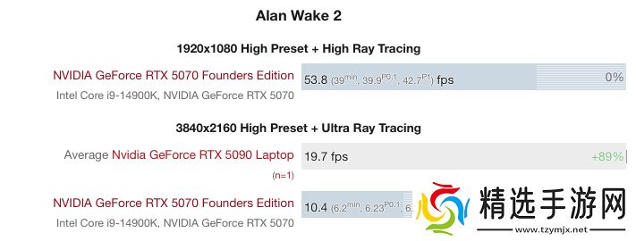 《博德之门 3》:1080P 分辨率下 5090 移动版平均 175.2 帧,5070 桌面版平均为 186.8 帧,5070 桌面版领先 7%,但在 4K 分辨率下,5090 移动版平均 82.1 帧,5070 桌面版为 70.9 帧,5090 移动版领先 16%。