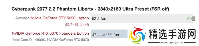 《赛博朋克 2077》:5090 移动版平均为 52.2 帧,5070 桌面版为 47.4 帧,5090 移动版领先 10%