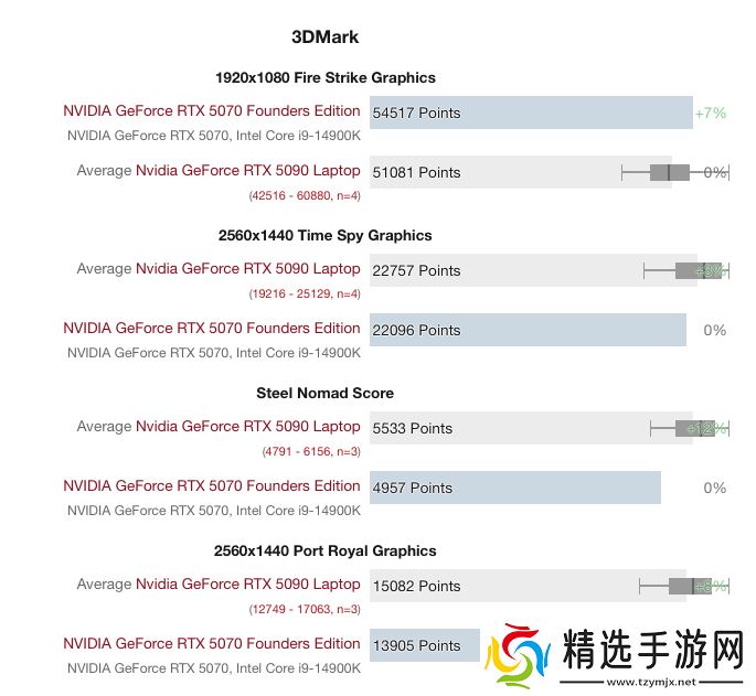 本站 4 月 7 日消息,海外媒体 NoteBook Check 昨日发布了英伟达 RTX 5090 移动版的跑分,整体上小幅领先于 RTX 5070 桌面版,由于搭载 24GB 显存,部分场景下表现明显优于该桌面版显卡。
