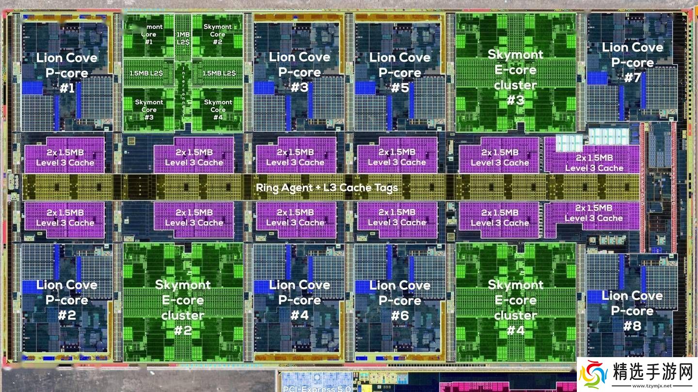 在处理器内部,8个性能核(P-core)和16个能效核(E-core)通过巧妙的布局设计,实现了性能与能效的完美结合。性能核分布在芯片的边缘与中心区域,而能效核则以四集群的形式穿插其间,挂在中央的Ring Agent环形总线上,以降低热密度并提高整体性能。