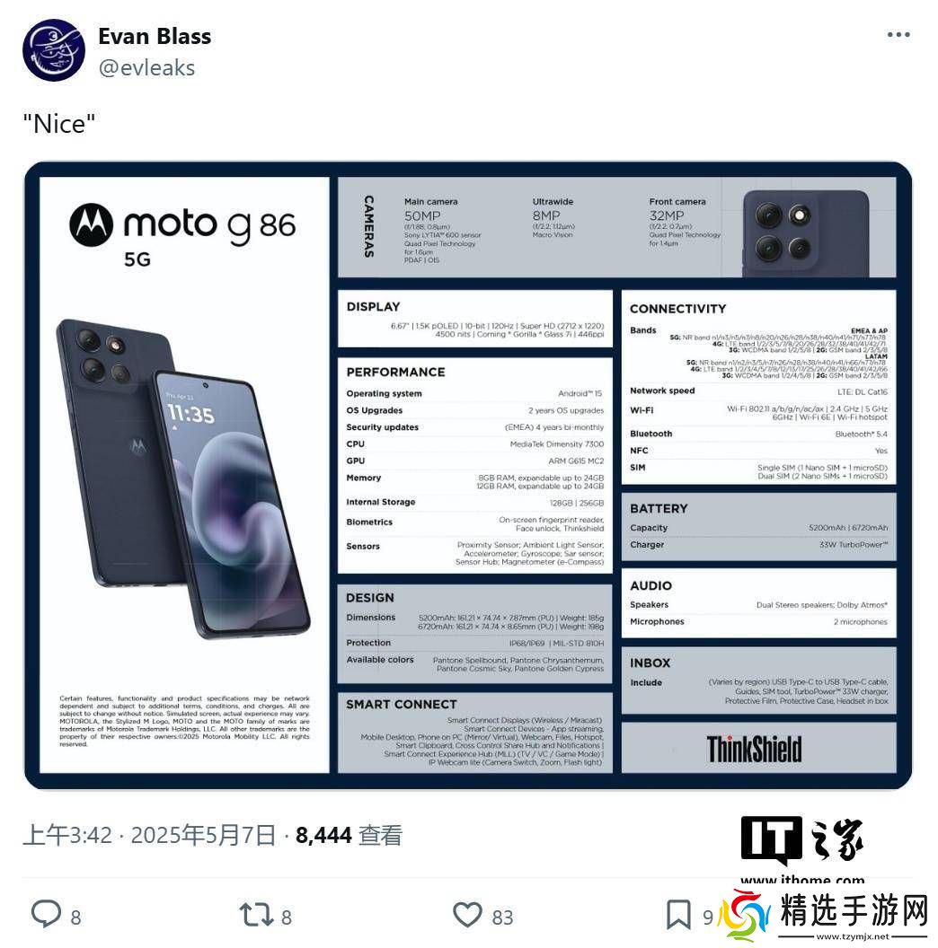 近日,知名爆料人士Evan Blass通过其社交媒体账号,揭晓了摩托罗拉即将推出的Moto G86 5G手机的详细配置及设计预览。这一消息紧随Moto G56 5G曝光之后,再次引发了科技爱好者的广泛关注。
