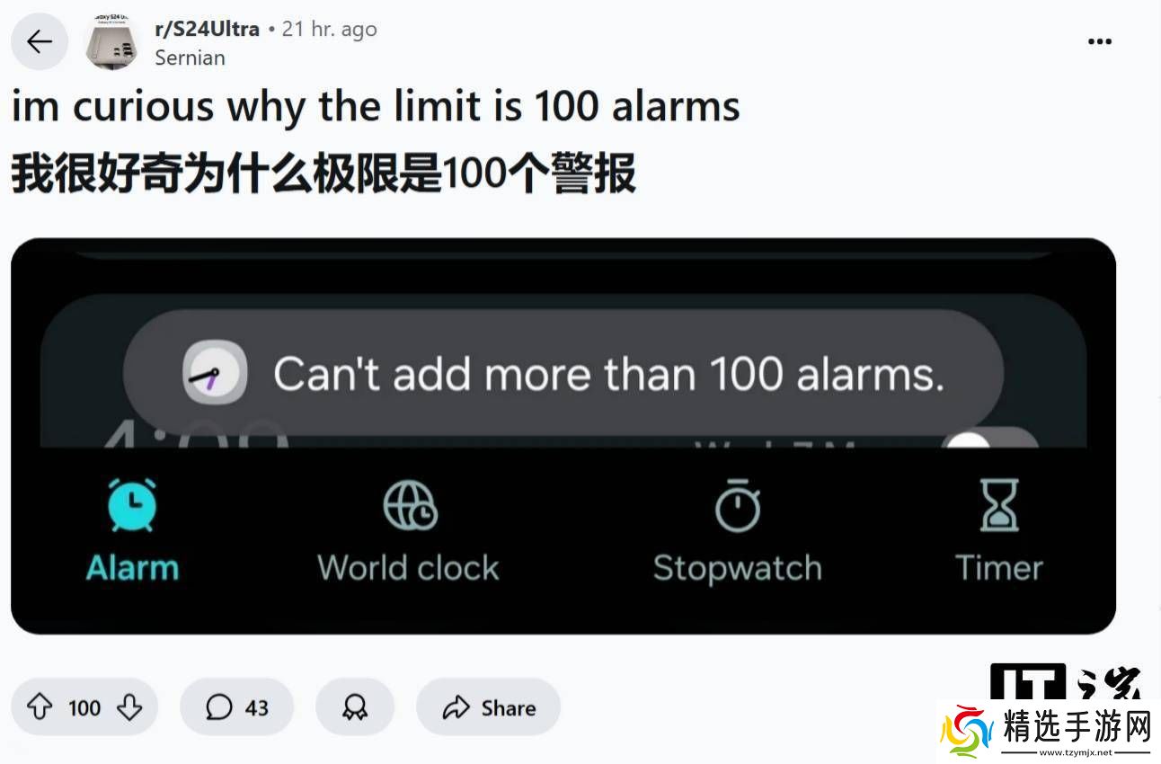这一发现最初由Reddit用户Sernian曝光。据他所述,当用户在手机中设置的闹钟数量达到100个后,便无法继续新增。值得注意的是,这一限制并非仅限于最新发布的Galaxy S24 Ultra,而是广泛适用于包括Galaxy S25 Ultra在内的多款三星设备。