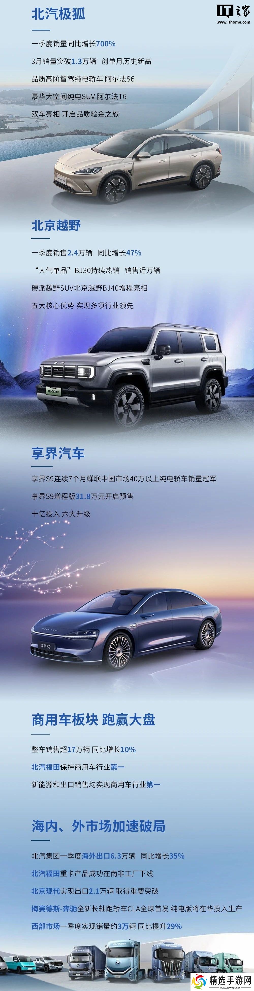 本站查询获悉,北汽极狐 3 月销量超 1.3 万辆,创单月历史新高,同时一季度销量同比增长 700%;北京越野一季度销售 2.4 万辆,同比增长 47%,其中 BJ30 车型销售近万辆;享界 S9 连续 7 个月蝉联中国市场 40 万以上纯电轿车销量冠军;商用车板块整车销售超 17 万辆,同比增长 10%,北汽福田保持商用车行业第一,新能源和出口销售均实现商用车行业第一。