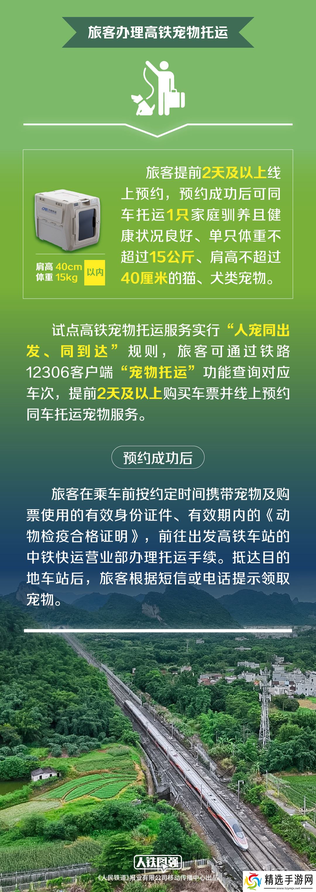 试点高铁宠物托运服务实行“人宠同出发、同到达”规则,旅客可通过铁路 12306 客户端“宠物托运”功能查询对应车次,提前 2 天及以上购买车票并线上预约同车托运宠物服务。预约成功后,旅客在乘车前按约定时间携带宠物及购票使用的有效身份证件、有效期内的《动物检疫合格证明》,前往出发高铁车站的中铁快运营业部办理托运手续。抵达目的地车站后,旅客根据短信或电话提示领取宠物。