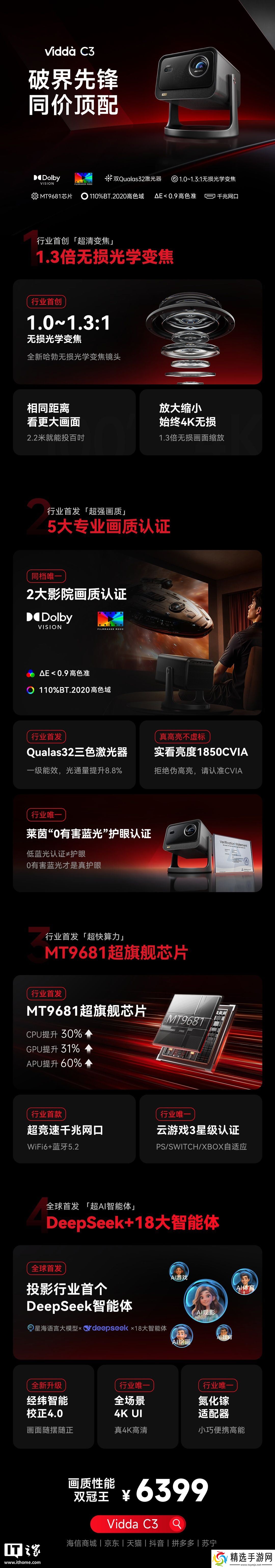 Vidda C3 首发价 6399 元,支持 1.3 倍无损光学变焦,搭载 MT9681 芯片、Qualas32 三色激光器,可达 1850 CVIA 流明亮度,还搭载 DeepSeek 智能体。