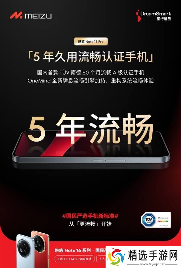 就在今日,星纪魅族科技官方宣布,魅族Note 16 Pro成功获得TÜV南德颁发的60个月流畅等级A级认证,成为国内首款获此殊荣的手机。这一认证背后,是魅族Note 16系列通过了星纪魅族实验室长达5年的系统流畅性测试。全新OneMind瞬息流畅引擎的加持,让魅族Note 16系列自信地喊出了“5年流畅”的口号。