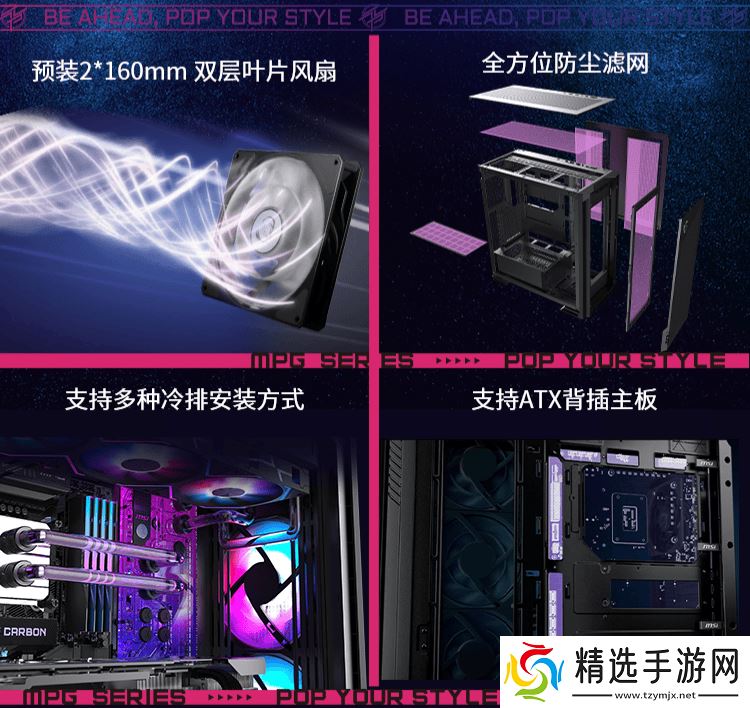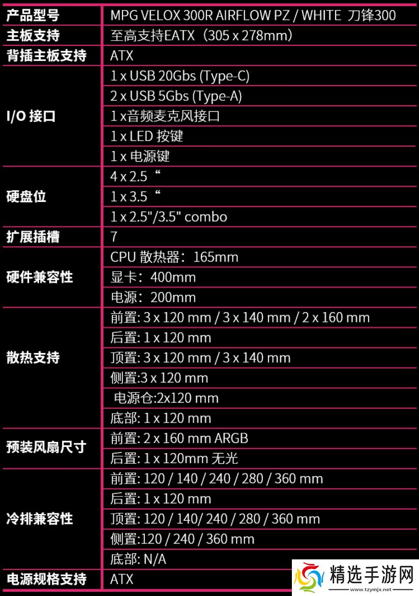 作为高性能硬件的理想伴侣,MPG VELOX 300R AIRFLOW PZ系列机箱在散热方面树立了新的标杆。其前部预装双160mm超大ARGB风扇,尾部标配120mm风扇,形成高效的垂直风道,确保内部组件得到充分的冷却。更令人瞩目的是,该机箱支持安装三个360mm AIO水冷散热器,无论是CPU还是显卡等高发热部件,都能得到有效的热量控制,保障系统稳定运行。