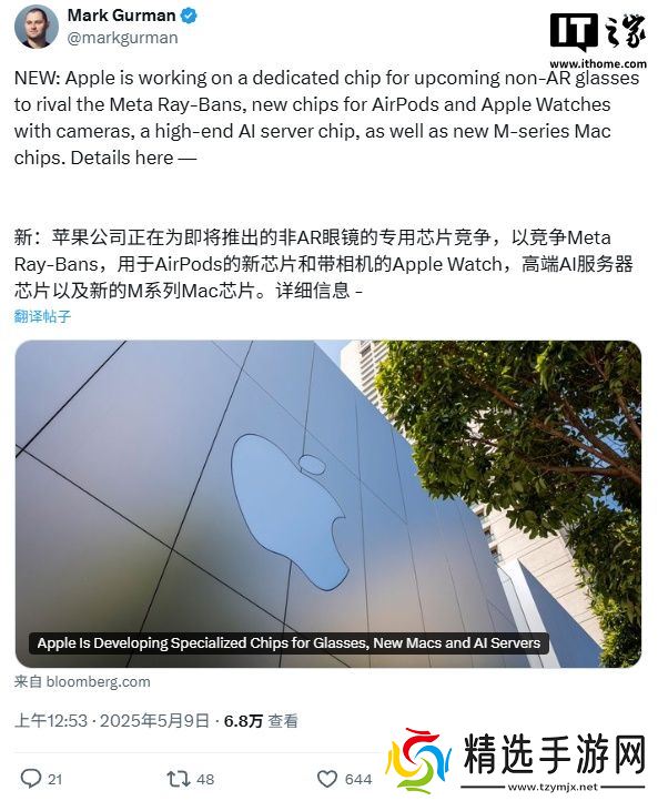 本站 5 月 9 日消息,彭博社马克・古尔曼今日报道称,苹果正在开发一款专为智能眼镜设计的新型芯片,目标在 2026 至 2027 年实现量产,计划未来两年左右推出对应的智能眼镜产品,与 Meta 旗下 Ray-Ban 直接竞争。