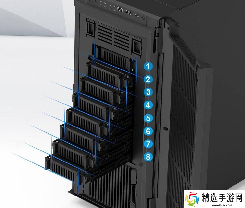 机箱的正面设计颇具特色,塑料门板下方被巧妙地分为三个区域。顶部是一个5.25英寸的光驱位,紧接着是8个支持SAS III 12Gbps/SATA III 6Gbps的热插拔硬盘托架,为数据存储提供了极大的便利。底部则是3个5.25英寸的光驱位或副电源位,设计灵活多变。