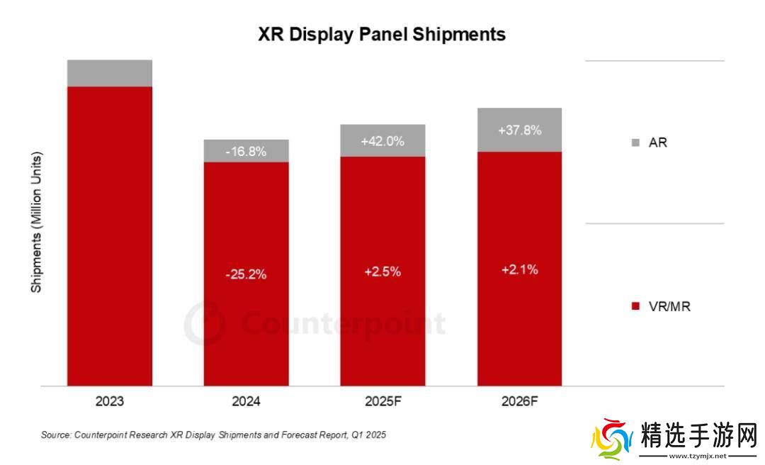 Counterpoint Research还预测,2026年XR市场将继续保持复苏态势,其中AR显示面板出货量将增长38%,而VR显示面板出货量则将增长2.1%。这一预测表明,尽管VR市场增长相对缓慢,但AR技术的快速发展将为整个XR市场带来新的增长点。