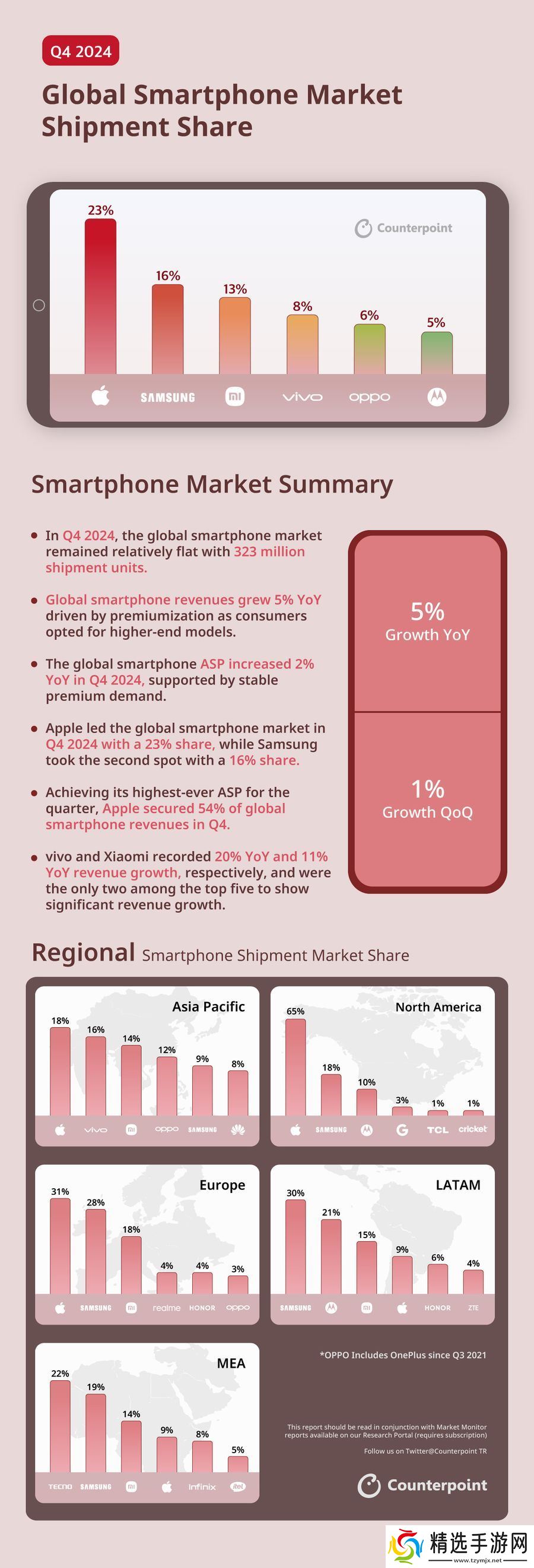 整体来看,高端智能手机的需求稳定,推动了市场收入的增长。尽管出货量未见显著提升,但消费者对高价位机型的偏好为市场注入了新的活力。未来,随着 5G 技术和创新功能的不断普及,高端市场或将继续成为全球智能手机行业的重要驱动力。