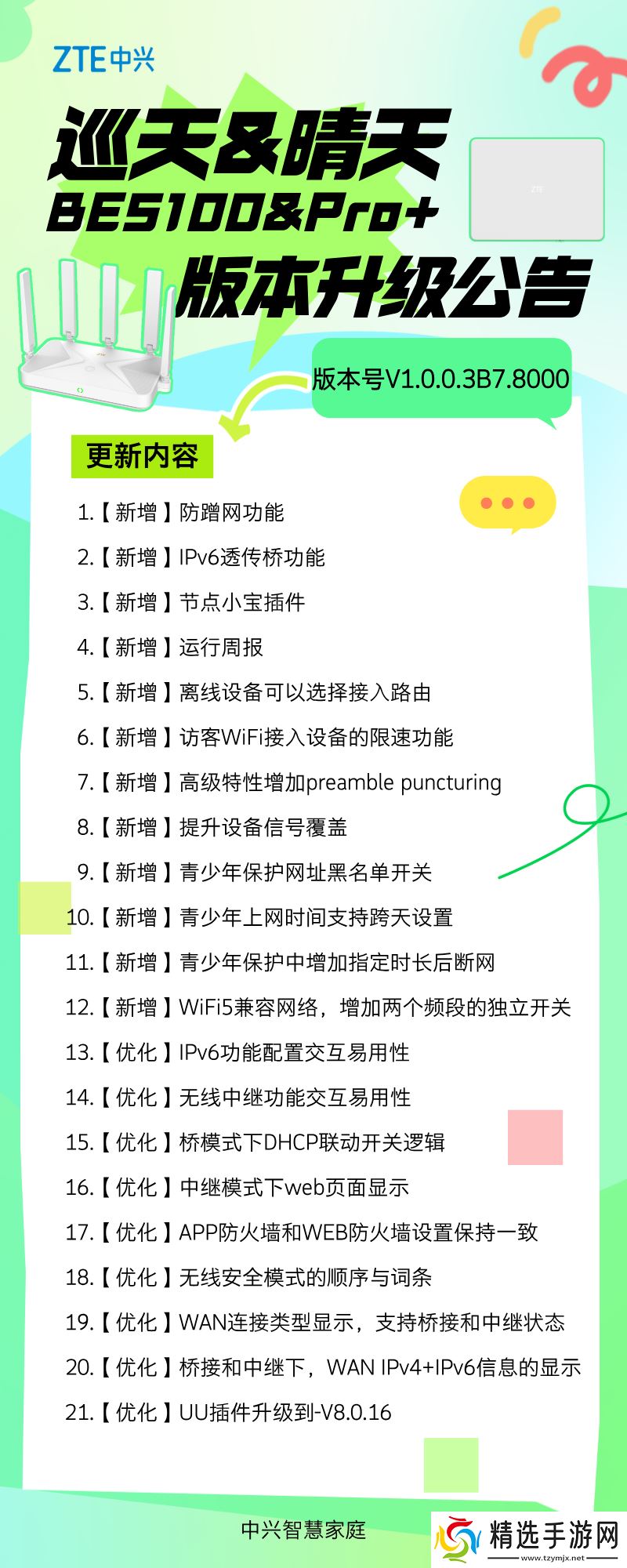 本站 5 月 9 日消息,中兴推送巡天 & 晴天 BE5100 / BE5100Pro + 路由器版本升级,版本号 V1.0.0.3B7.8000。
