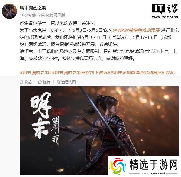 不仅如此,《明末:渊虚之羽》还计划在上海与成都两地举办额外的试玩活动,分别安排在5月10日至11日(上海站)和5月17日至18日(成都站)。据官方透露,试玩活动的报名招募即将启动。由于场地及多种因素的限制,北京站的试玩时长暂定为1小时,而上海站与成都站则延长至4小时,具体安排以现场实际情况为准。